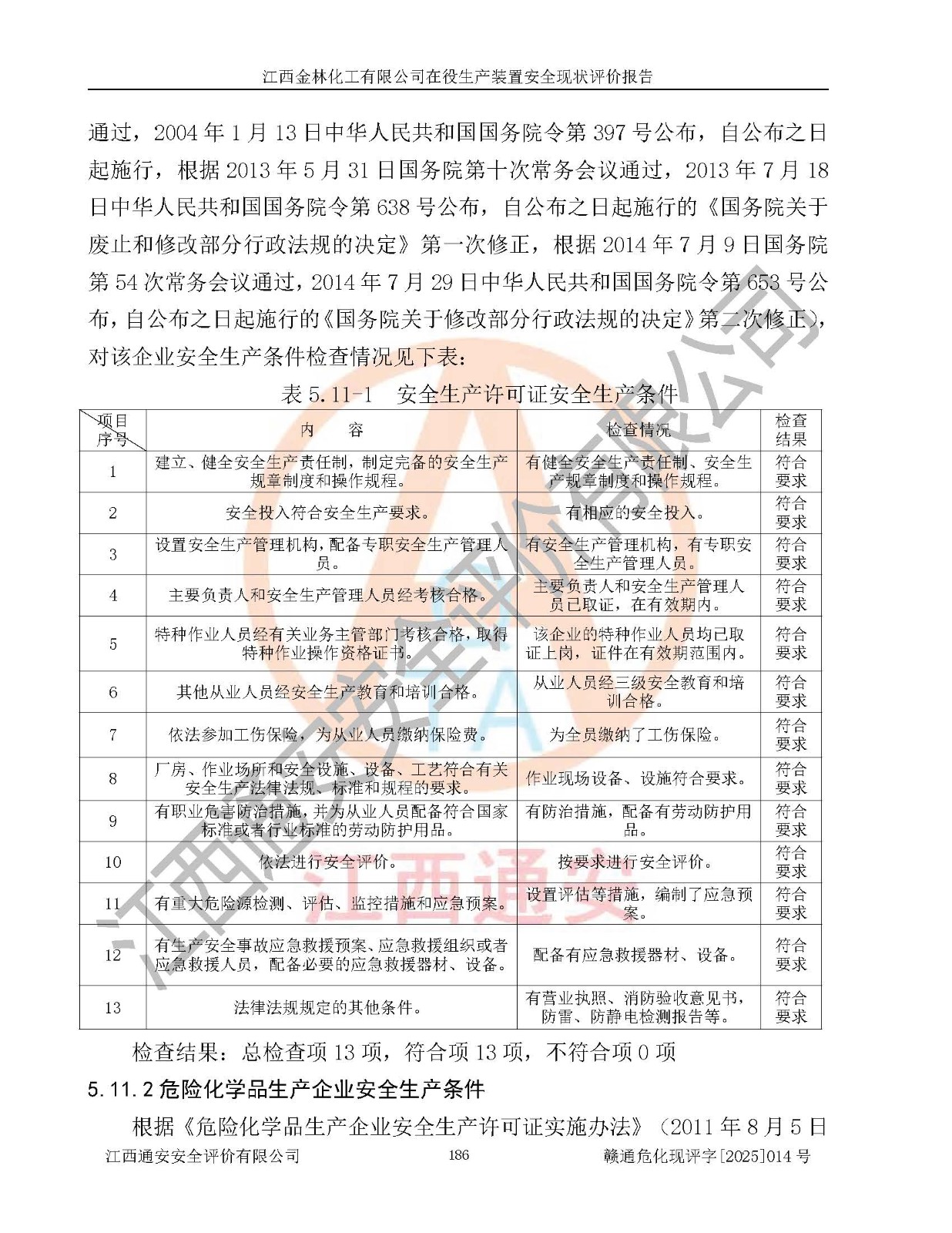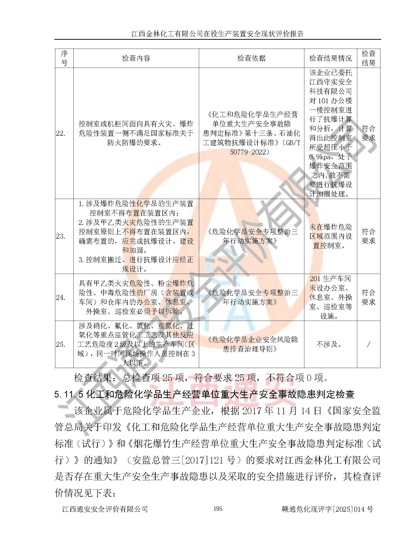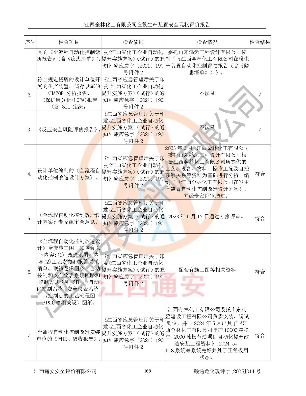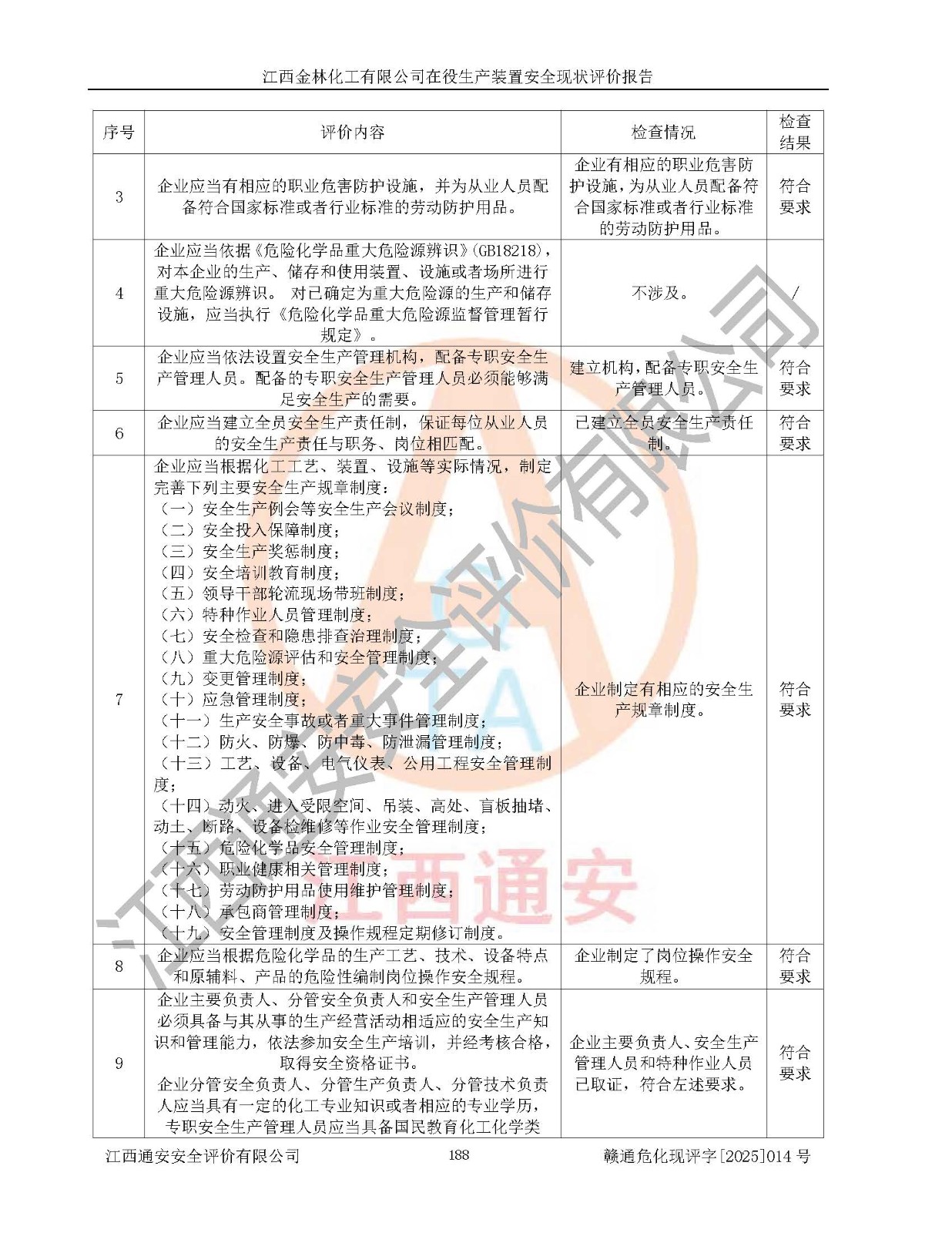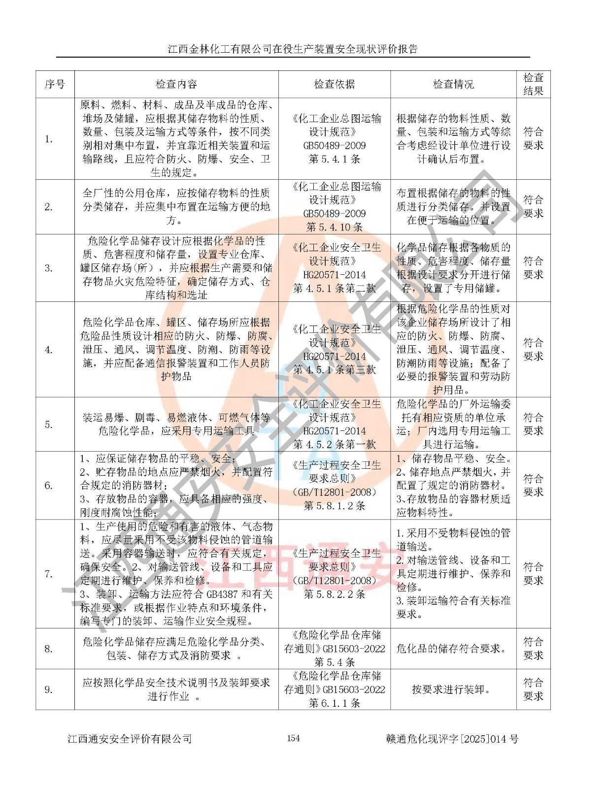 評價結(jié)論 | 江西金林化工有限公司在役生產(chǎn)裝置現(xiàn)場情況與設(shè)計圖紙一致,安全監(jiān)測監(jiān)控系統(tǒng)與設(shè)計一致,并**運行,有關(guān)從業(yè)人員資格符合《江西省危險化學(xué)品安全專項整治三年行動實施方案》要求,安全設(shè)施及安全管理符合**及有關(guān)部門關(guān)于安全生產(chǎn)法律法規(guī)、標準的要求,安全設(shè)施正常投用且運行**,安全風(fēng)險是可以控制的,其風(fēng)險程度是可以接受的,安全現(xiàn)狀符合安全生產(chǎn)條件,能夠滿足安全生產(chǎn)的要求。 | |||