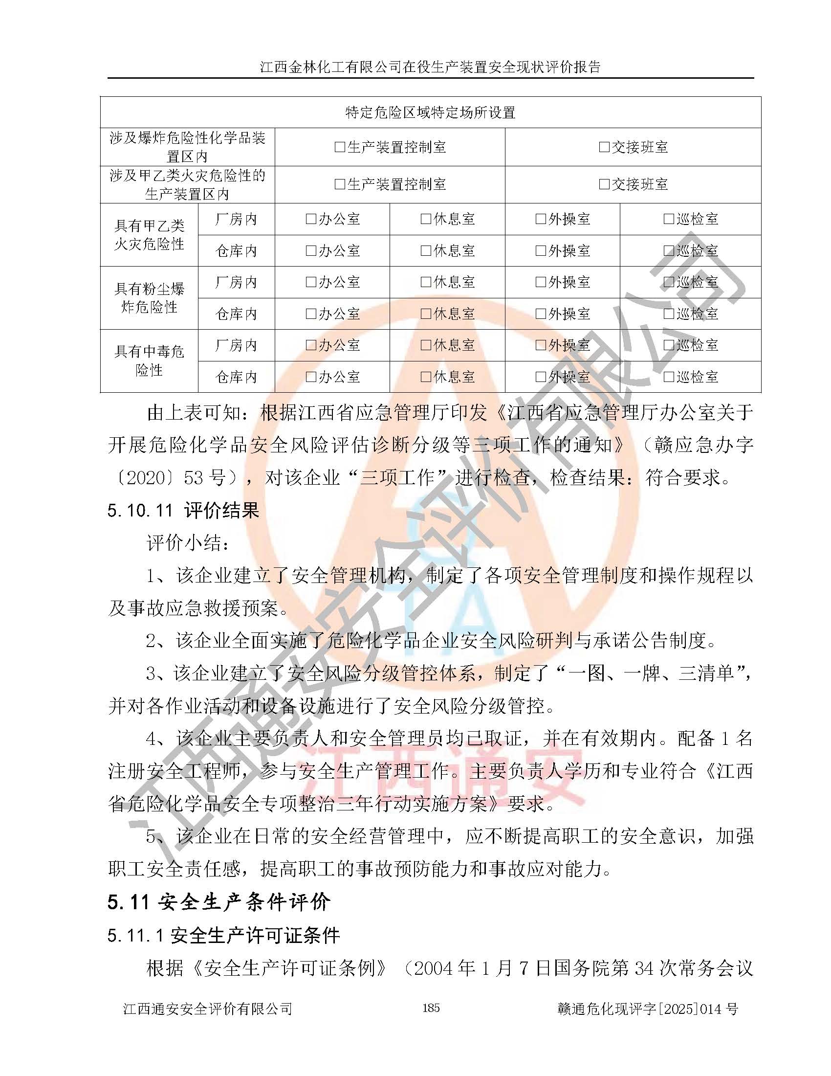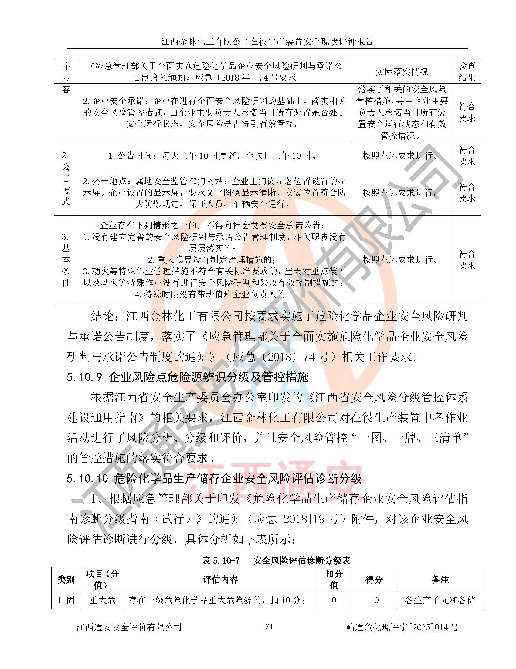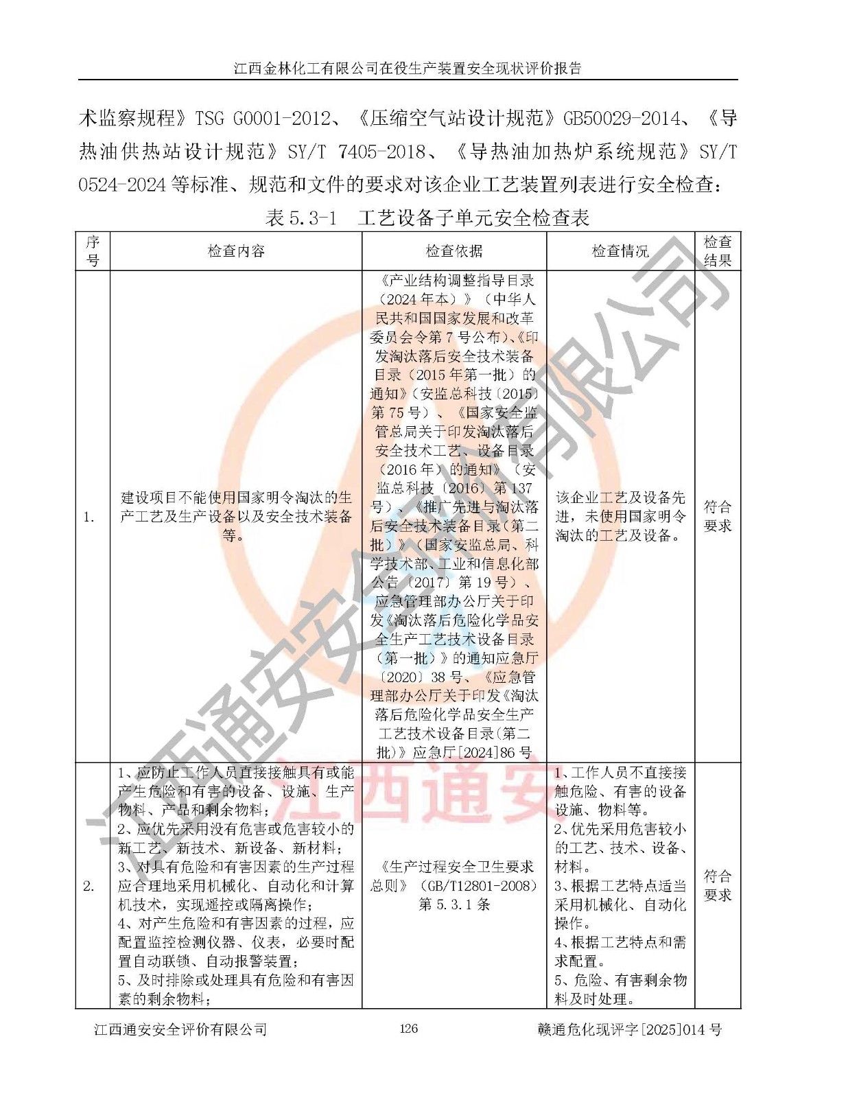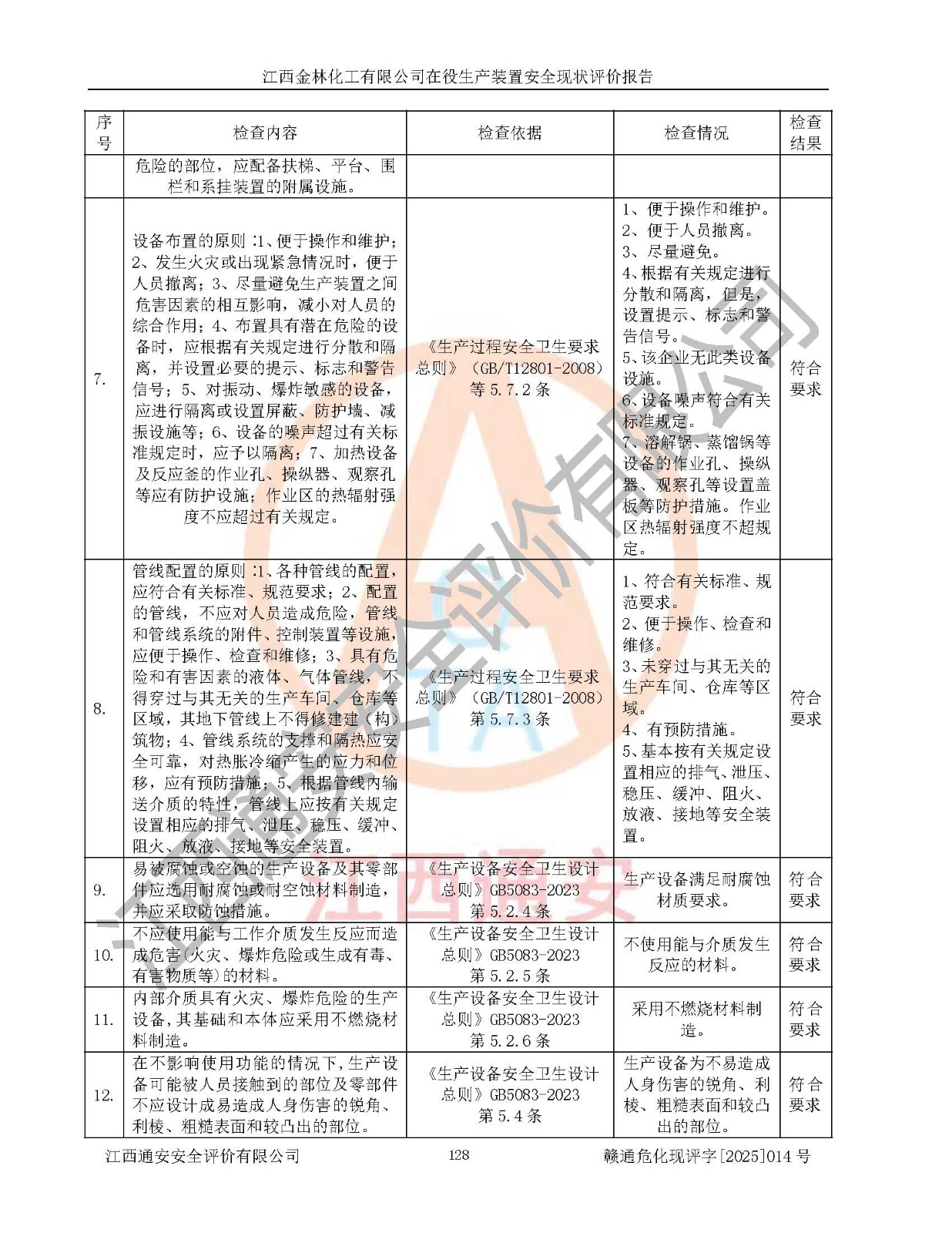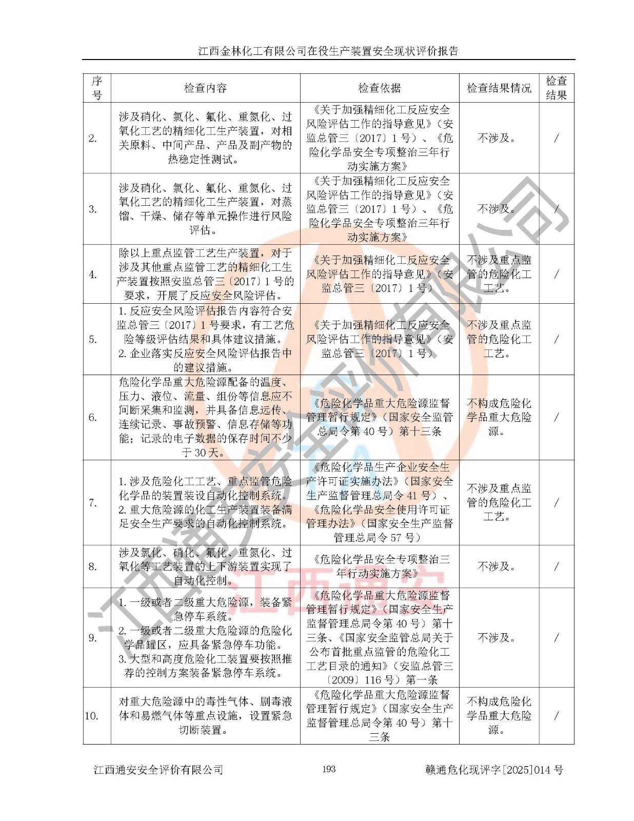 評價結(jié)論 | 江西金林化工有限公司在役生產(chǎn)裝置現(xiàn)場情況與設(shè)計圖紙一致,安全監(jiān)測監(jiān)控系統(tǒng)與設(shè)計一致,并**運行,有關(guān)從業(yè)人員資格符合《江西省危險化學(xué)品安全專項整治三年行動實施方案》要求,安全設(shè)施及安全管理符合**及有關(guān)部門關(guān)于安全生產(chǎn)法律法規(guī)、標準的要求,安全設(shè)施正常投用且運行**,安全風(fēng)險是可以控制的,其風(fēng)險程度是可以接受的,安全現(xiàn)狀符合安全生產(chǎn)條件,能夠滿足安全生產(chǎn)的要求。 | |||