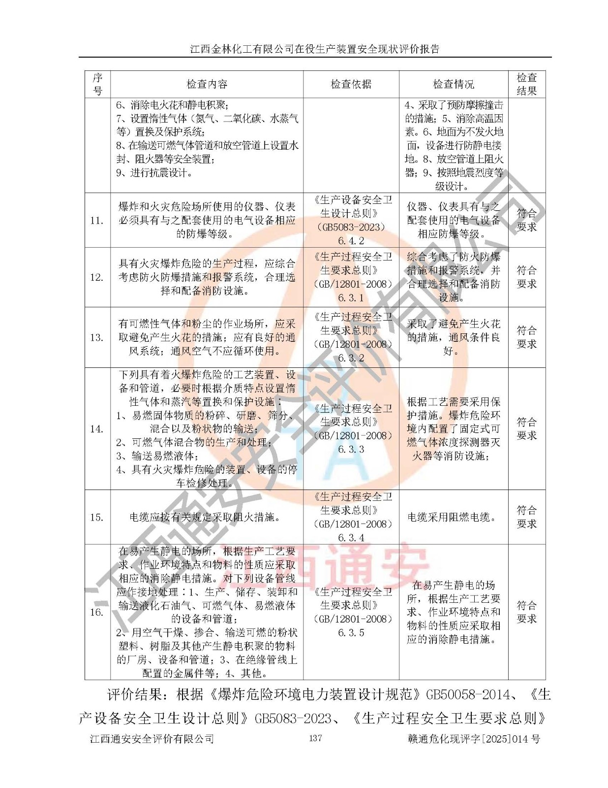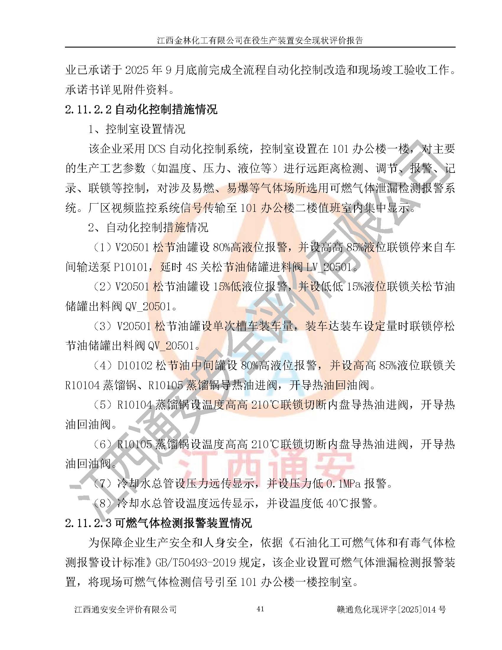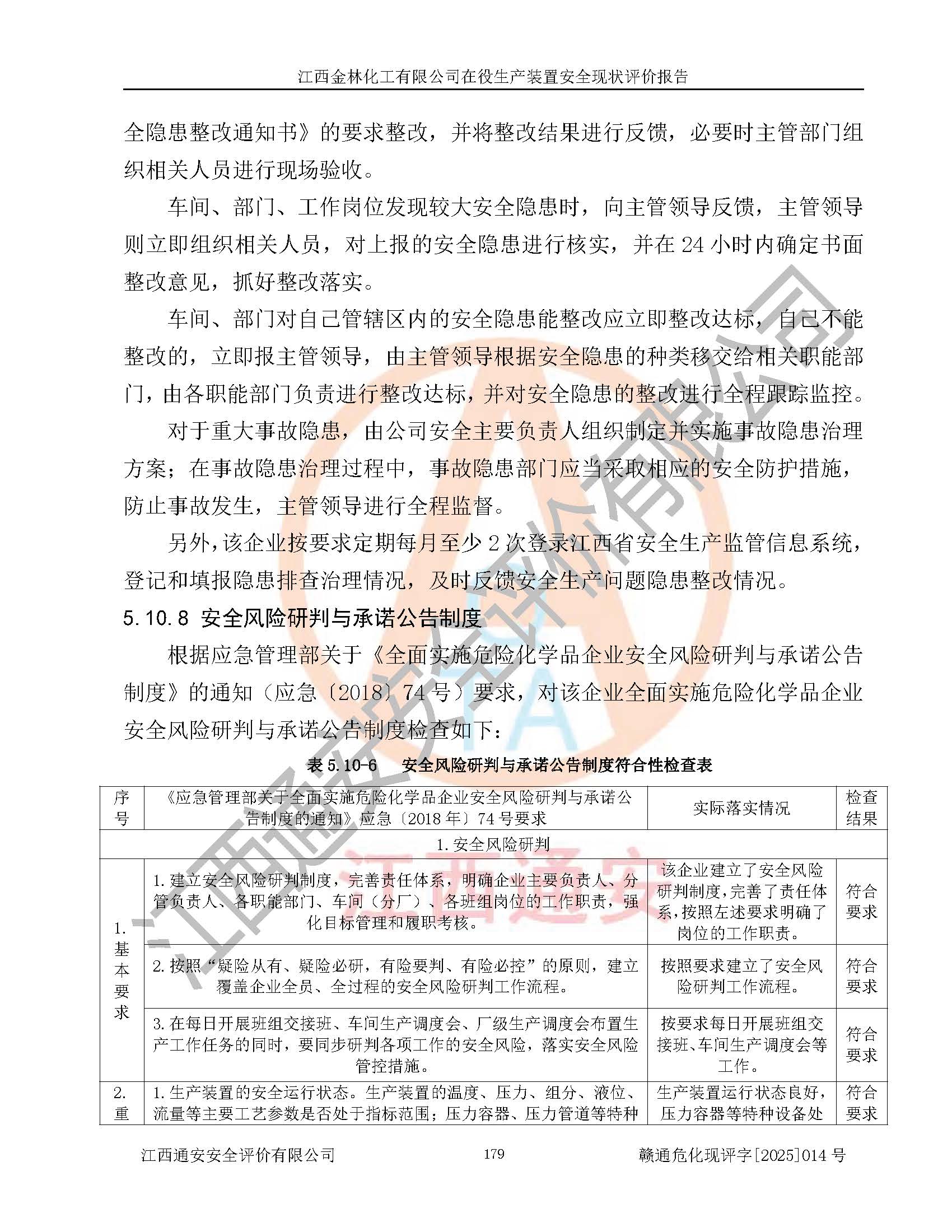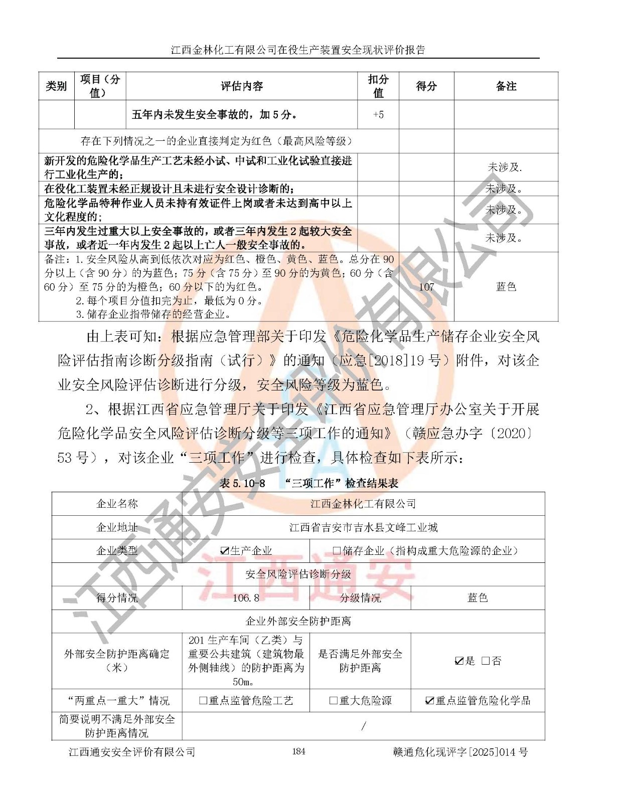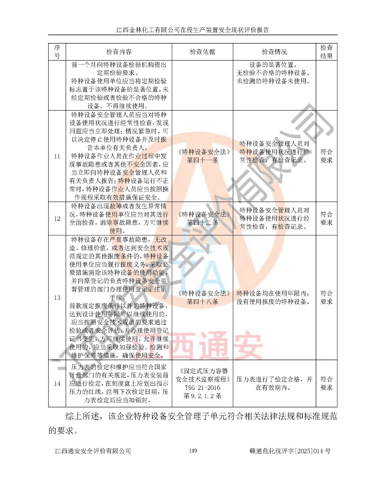 評價結(jié)論 | 江西金林化工有限公司在役生產(chǎn)裝置現(xiàn)場情況與設(shè)計圖紙一致,安全監(jiān)測監(jiān)控系統(tǒng)與設(shè)計一致,并**運行,有關(guān)從業(yè)人員資格符合《江西省危險化學(xué)品安全專項整治三年行動實施方案》要求,安全設(shè)施及安全管理符合**及有關(guān)部門關(guān)于安全生產(chǎn)法律法規(guī)、標準的要求,安全設(shè)施正常投用且運行**,安全風(fēng)險是可以控制的,其風(fēng)險程度是可以接受的,安全現(xiàn)狀符合安全生產(chǎn)條件,能夠滿足安全生產(chǎn)的要求。 | |||