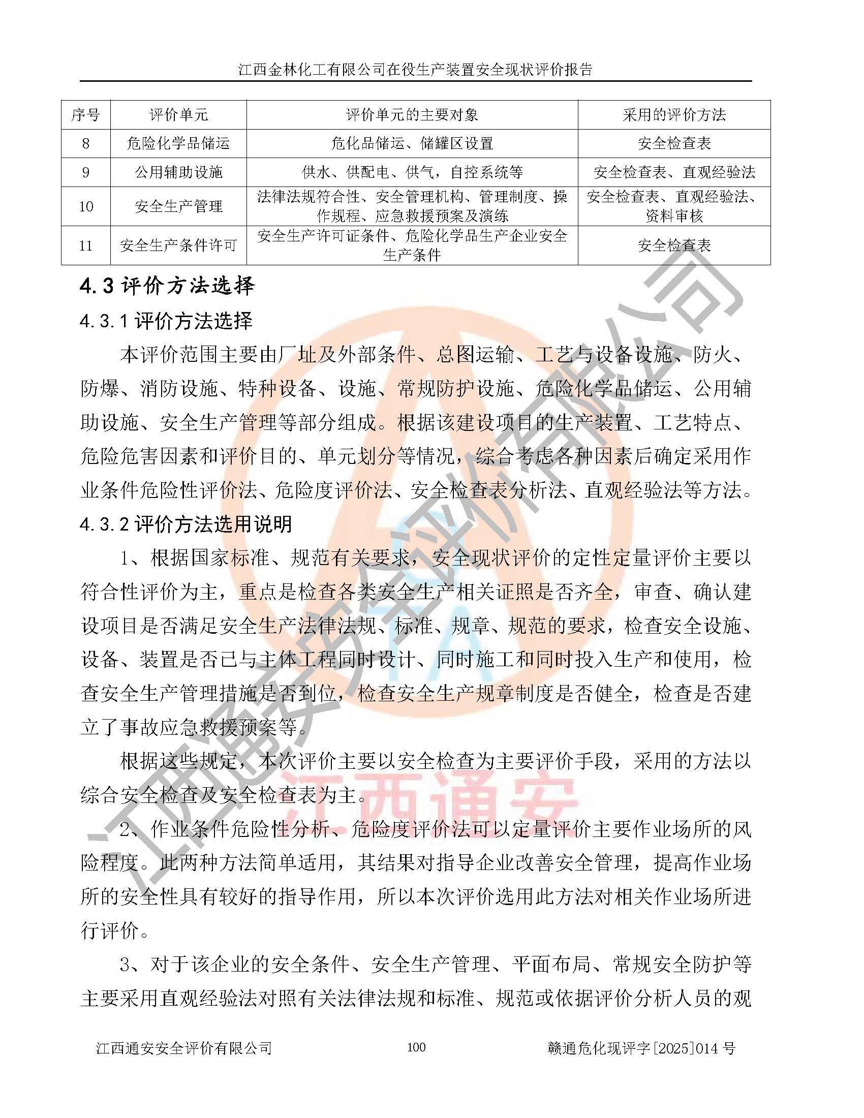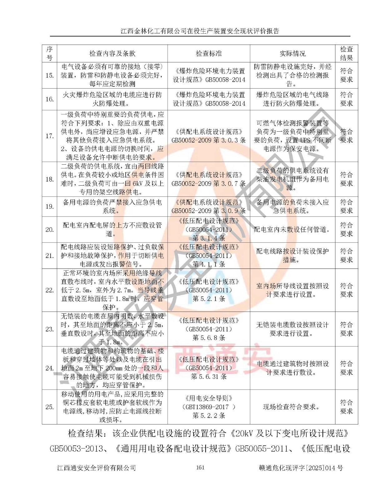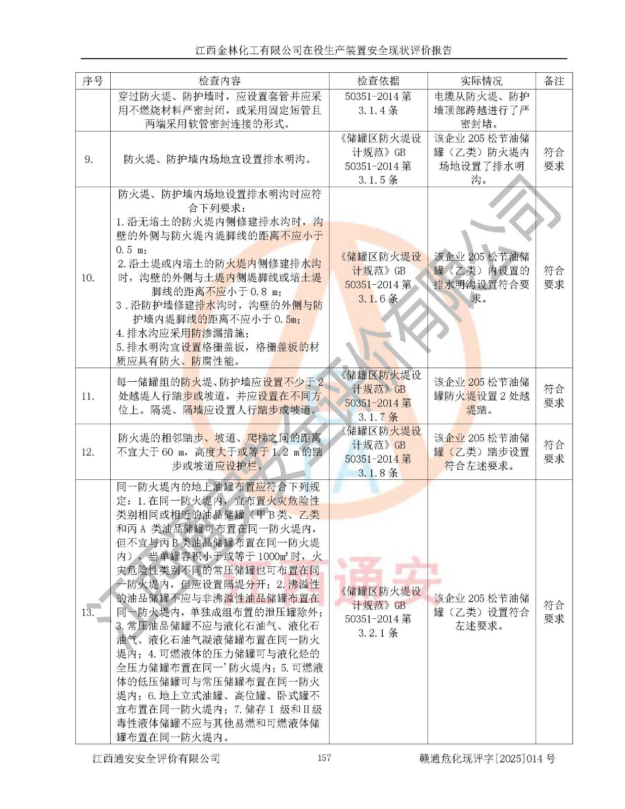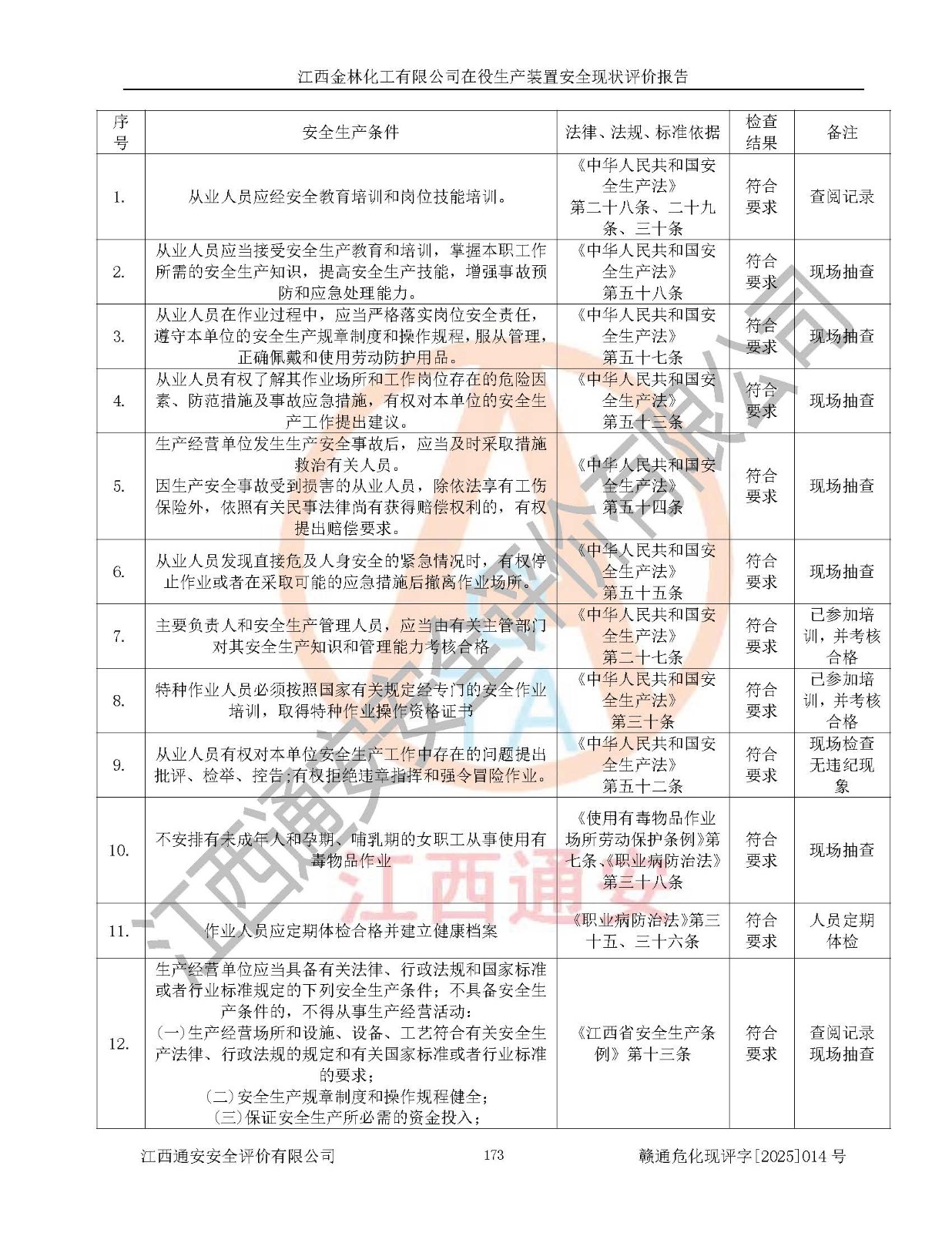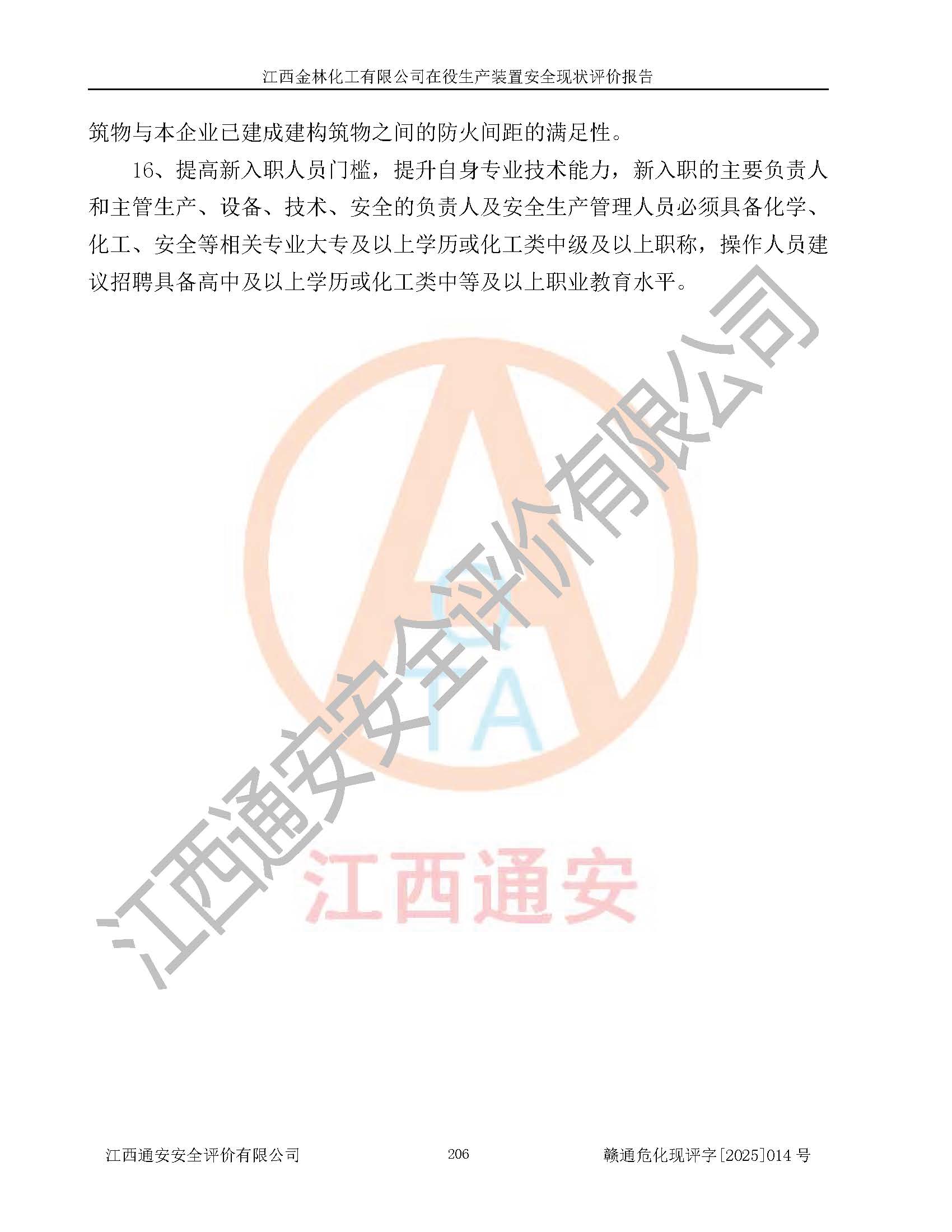 評價結(jié)論 | 江西金林化工有限公司在役生產(chǎn)裝置現(xiàn)場情況與設(shè)計圖紙一致,安全監(jiān)測監(jiān)控系統(tǒng)與設(shè)計一致,并**運行,有關(guān)從業(yè)人員資格符合《江西省危險化學(xué)品安全專項整治三年行動實施方案》要求,安全設(shè)施及安全管理符合**及有關(guān)部門關(guān)于安全生產(chǎn)法律法規(guī)、標準的要求,安全設(shè)施正常投用且運行**,安全風(fēng)險是可以控制的,其風(fēng)險程度是可以接受的,安全現(xiàn)狀符合安全生產(chǎn)條件,能夠滿足安全生產(chǎn)的要求。 | |||
