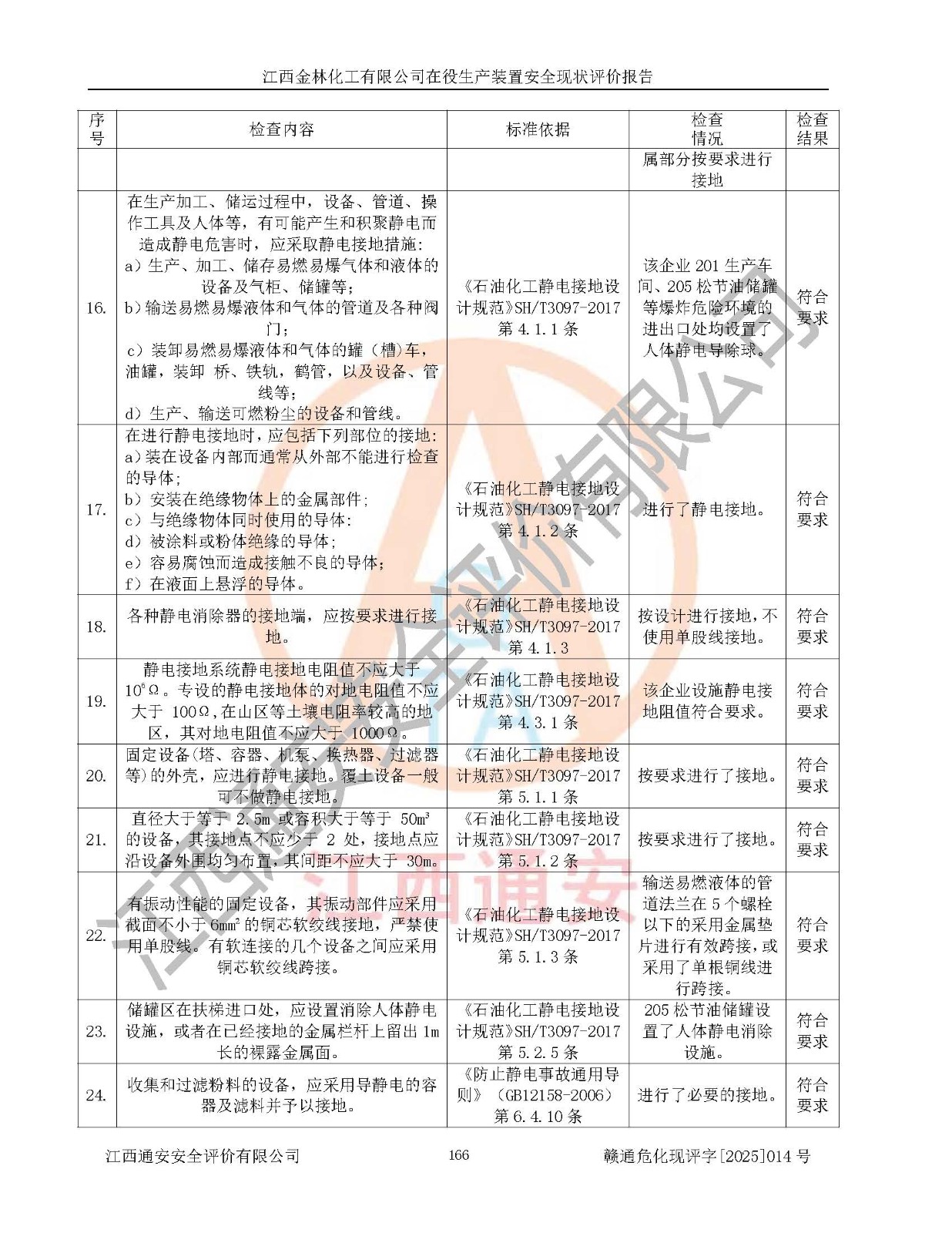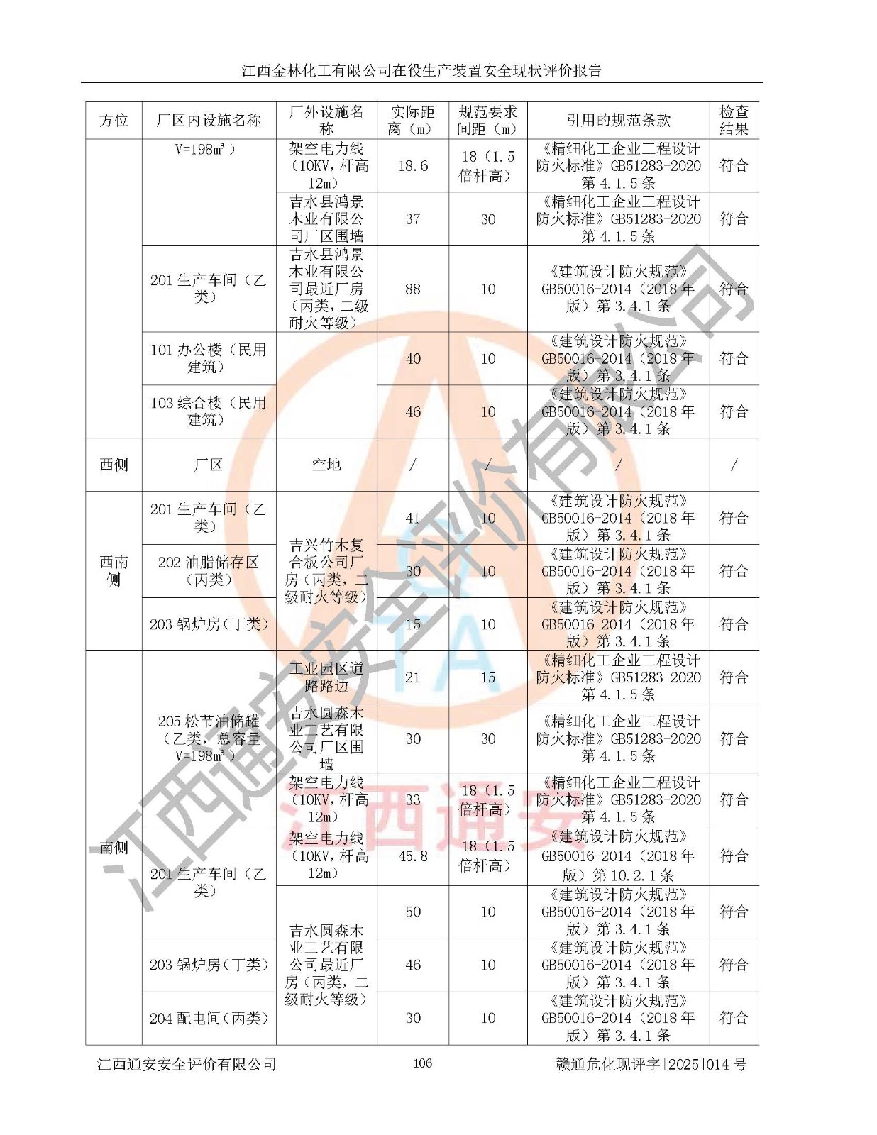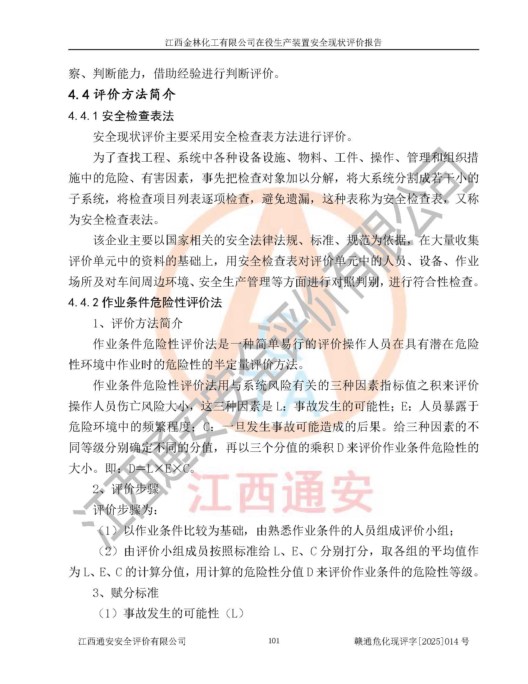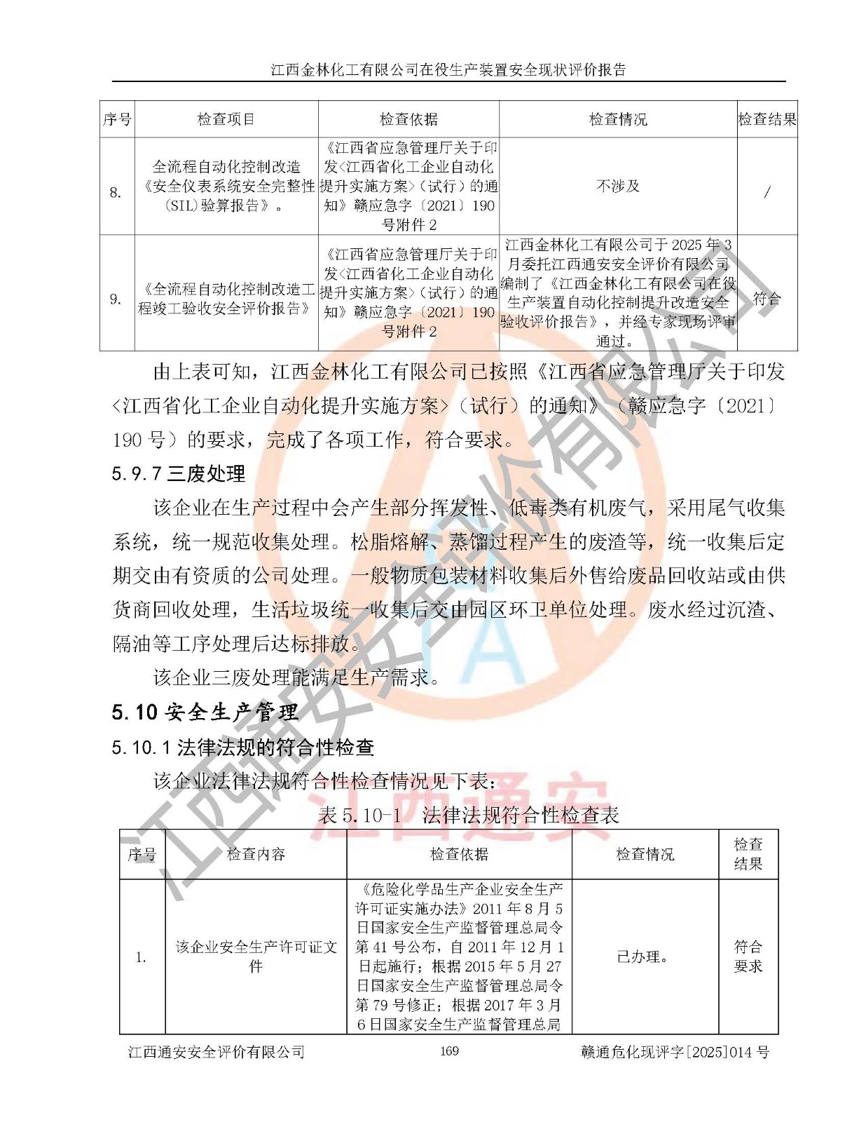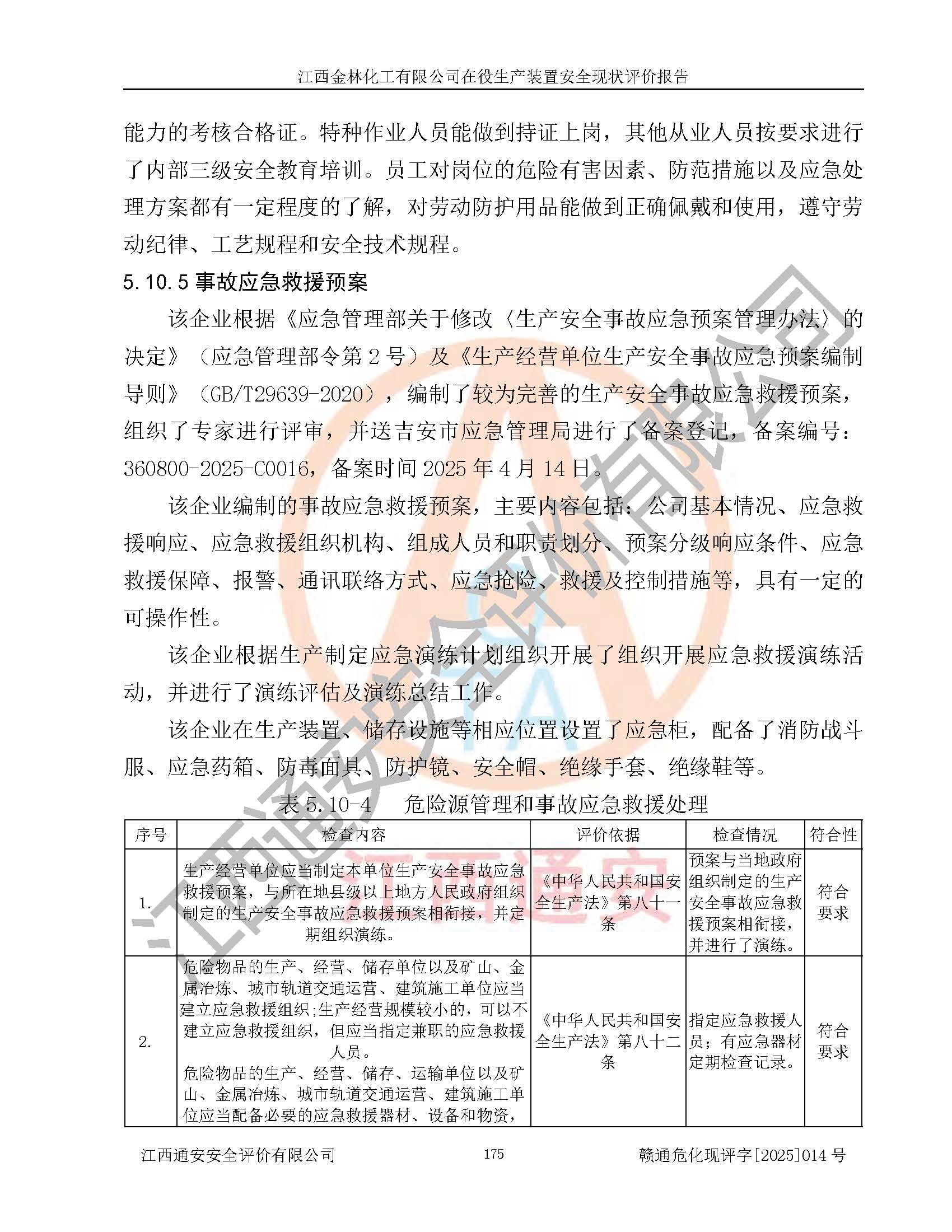 評價結(jié)論 | 江西金林化工有限公司在役生產(chǎn)裝置現(xiàn)場情況與設(shè)計圖紙一致,安全監(jiān)測監(jiān)控系統(tǒng)與設(shè)計一致,并**運行,有關(guān)從業(yè)人員資格符合《江西省危險化學(xué)品安全專項整治三年行動實施方案》要求,安全設(shè)施及安全管理符合**及有關(guān)部門關(guān)于安全生產(chǎn)法律法規(guī)、標準的要求,安全設(shè)施正常投用且運行**,安全風(fēng)險是可以控制的,其風(fēng)險程度是可以接受的,安全現(xiàn)狀符合安全生產(chǎn)條件,能夠滿足安全生產(chǎn)的要求。 | |||