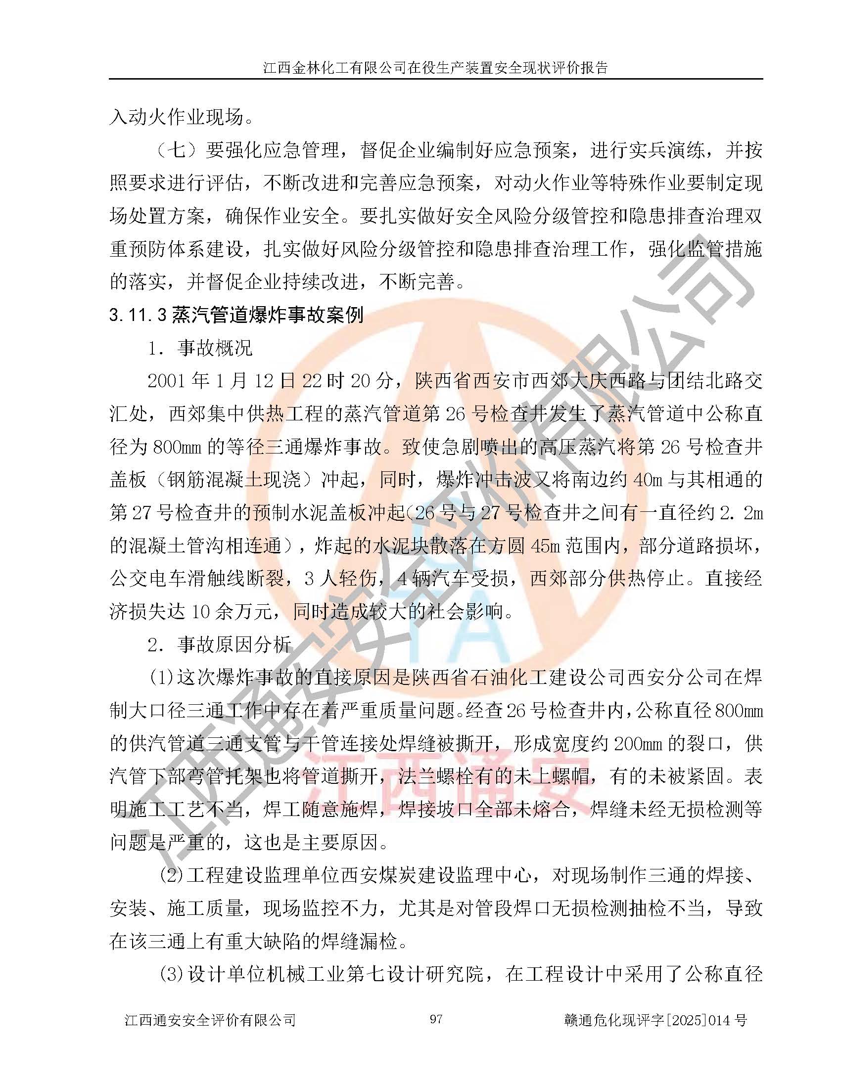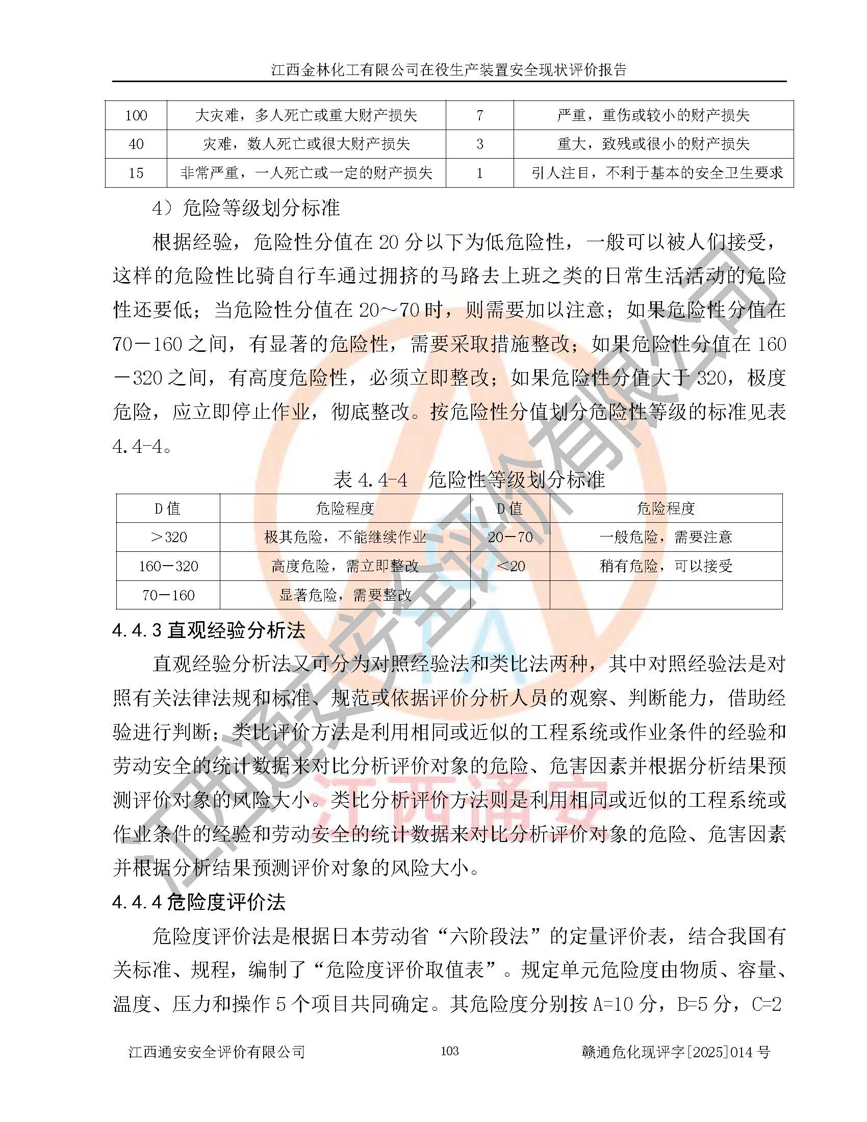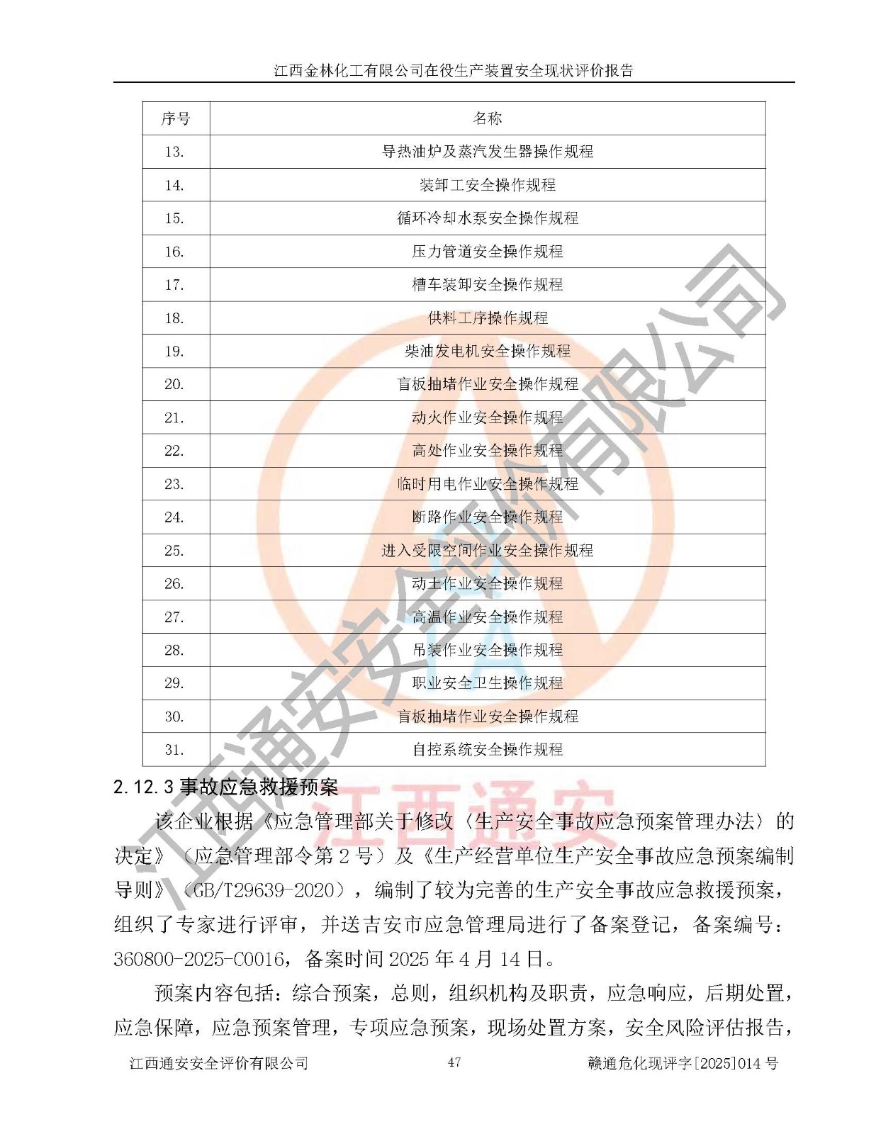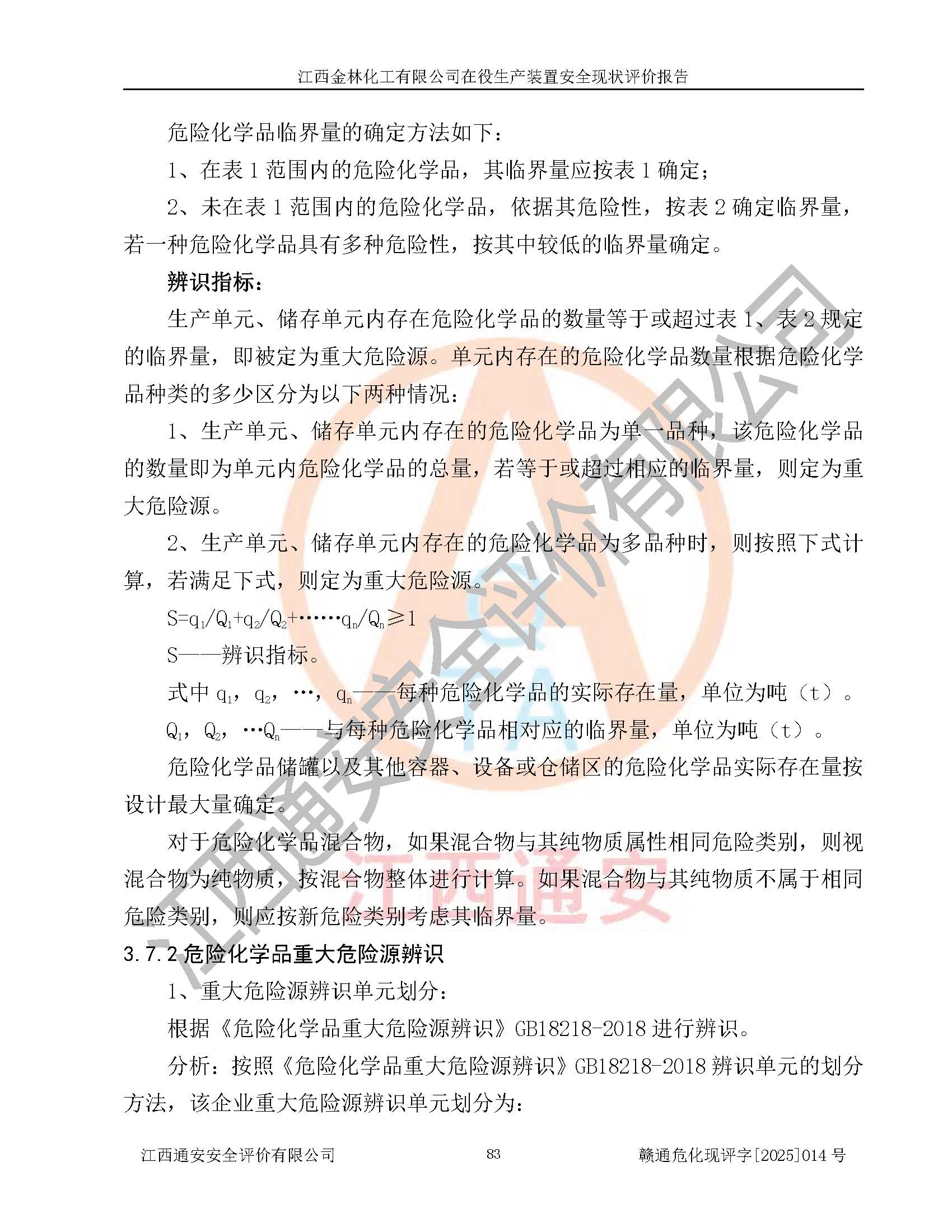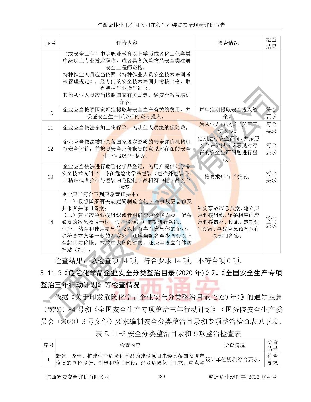 評價結(jié)論 | 江西金林化工有限公司在役生產(chǎn)裝置現(xiàn)場情況與設(shè)計圖紙一致,安全監(jiān)測監(jiān)控系統(tǒng)與設(shè)計一致,并**運行,有關(guān)從業(yè)人員資格符合《江西省危險化學(xué)品安全專項整治三年行動實施方案》要求,安全設(shè)施及安全管理符合**及有關(guān)部門關(guān)于安全生產(chǎn)法律法規(guī)、標準的要求,安全設(shè)施正常投用且運行**,安全風(fēng)險是可以控制的,其風(fēng)險程度是可以接受的,安全現(xiàn)狀符合安全生產(chǎn)條件,能夠滿足安全生產(chǎn)的要求。 | |||
