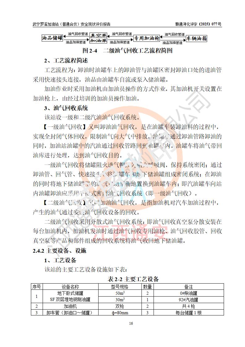 項目簡介 | 武寧羅溪加油站(普通合伙)是一家專門從事成品油零售經(jīng)營的普通合伙企業(yè),經(jīng)營場所位于江西省九江市武寧縣羅溪集鎮(zhèn)南側(cè)?,F(xiàn)有從業(yè)人員6名,其中安全管理人員1人,加油站負責人王智勇。 該加油站占地面積約2138.6m2,站區(qū)內(nèi)設(shè)置有2臺雙槍程控燃油加油機及配套的工藝管線、設(shè)有SF雙層儲罐3臺,其中50m3的0#柴油儲罐2臺、30m3的92#汽油儲罐1臺,油品儲罐總?cè)莘e為130m3(折算成汽油為80m3),按現(xiàn)行《汽車加油加氣加氫站技術(shù)標準》對加油站的等級劃分原則,屬三級加油站。 該站由九江市行政審批局換發(fā)《危險化學(xué)品經(jīng)營許可證》(證號:贛九行審經(jīng)(甲)字[2022]0000180號),**期限2022年12月01日至2025年11月30日。 | |||