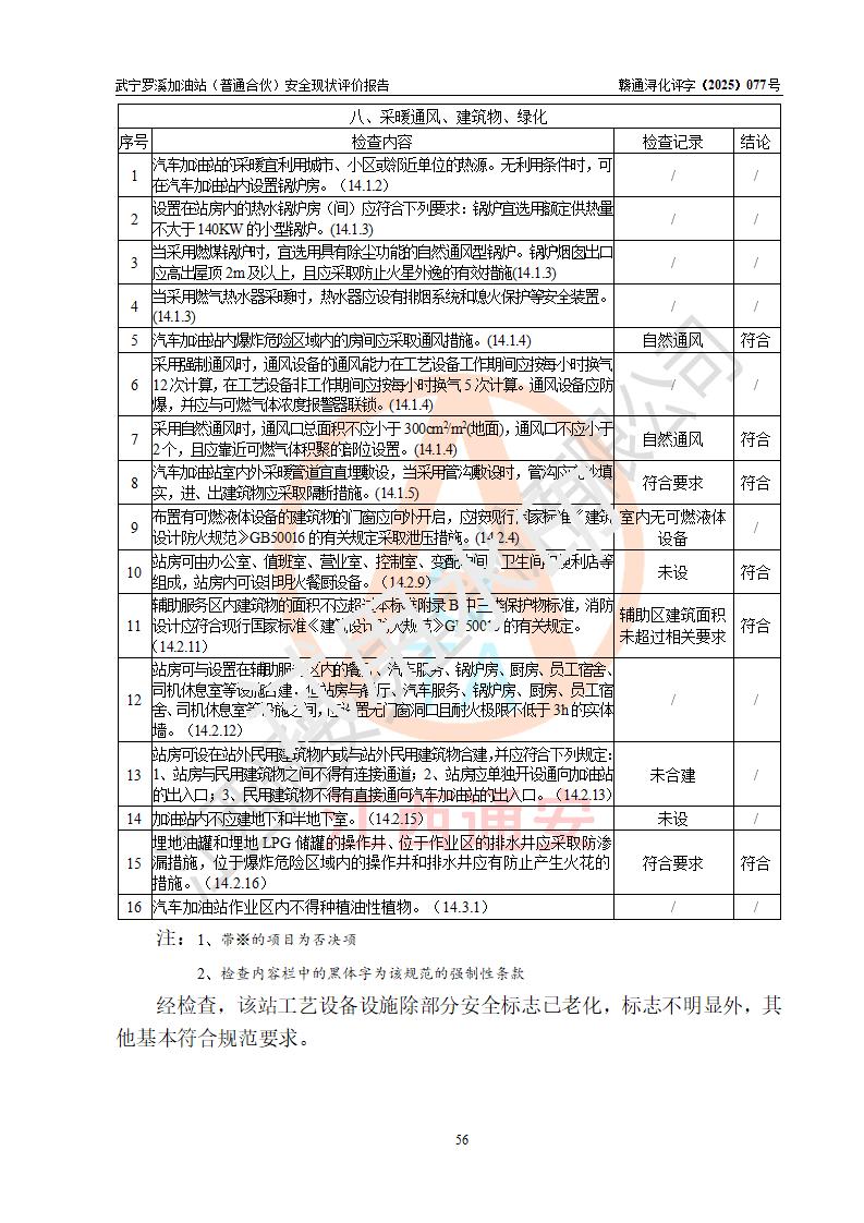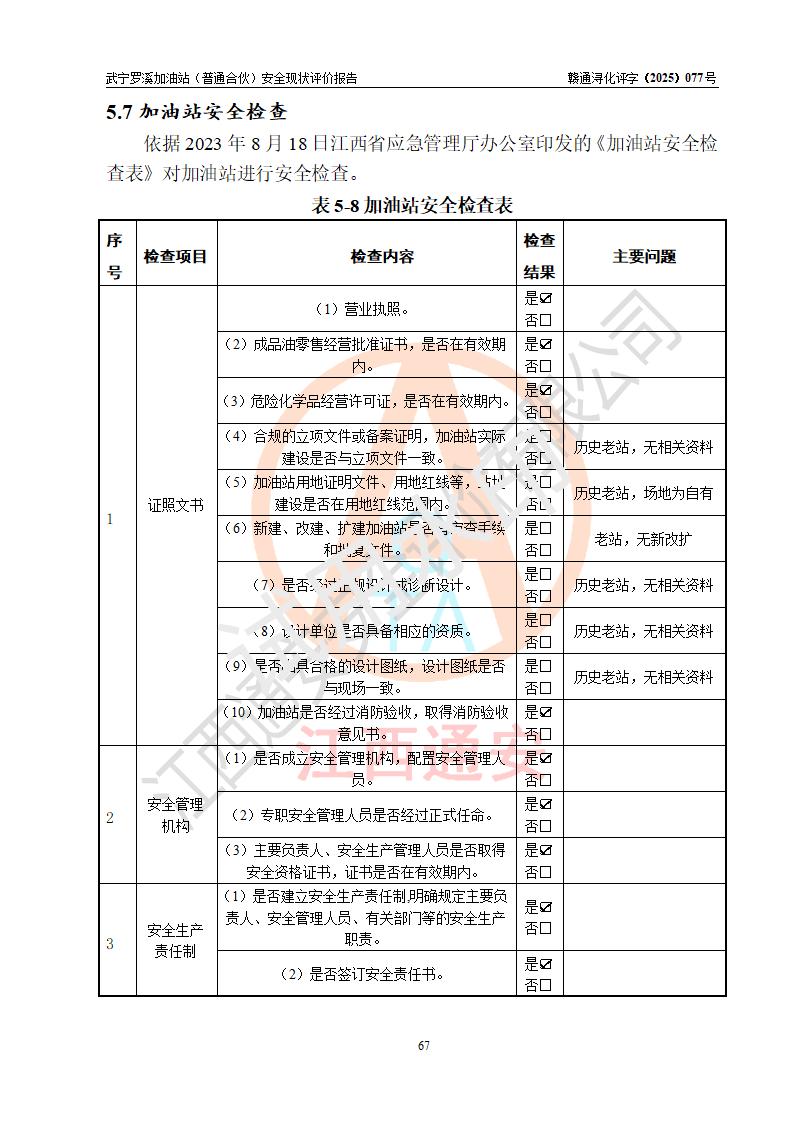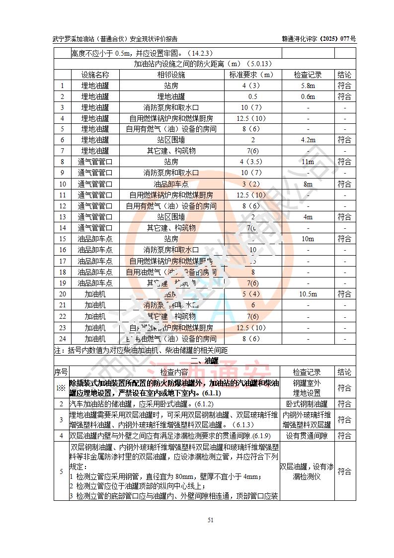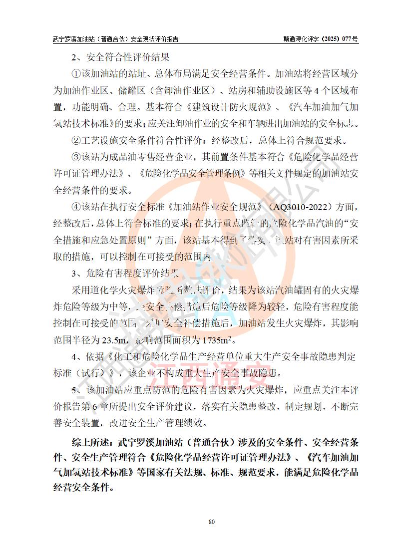 評價結(jié)論 | 武寧羅溪加油站(普通合伙)涉及的安全條件、安全經(jīng)營條件、安全生產(chǎn)管理符合《危險化學(xué)品經(jīng)營許可證管理辦法》、《汽車加油加氣加氫站技術(shù)標準》等**有關(guān)法規(guī)、標準、規(guī)范要求,能滿足危險化學(xué)品經(jīng)營安全條件。 | |||