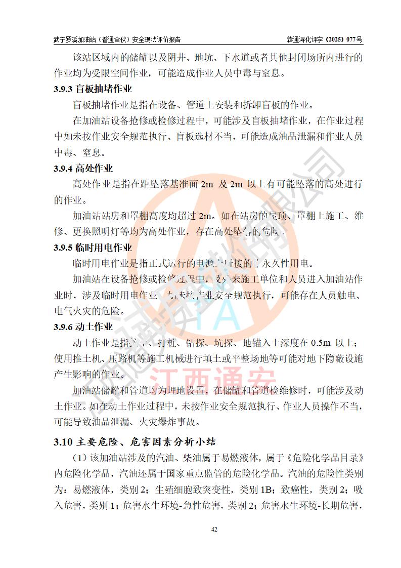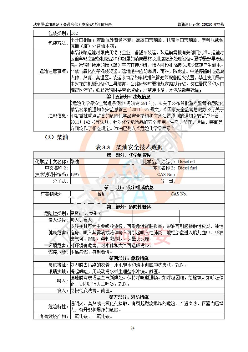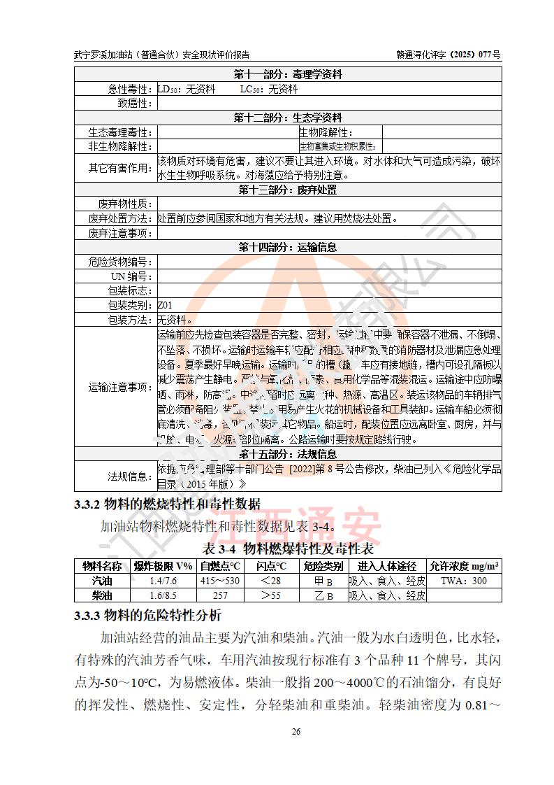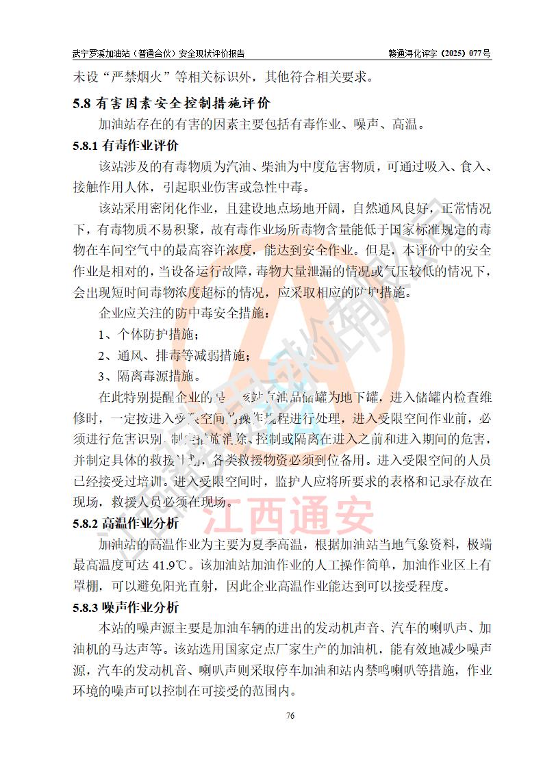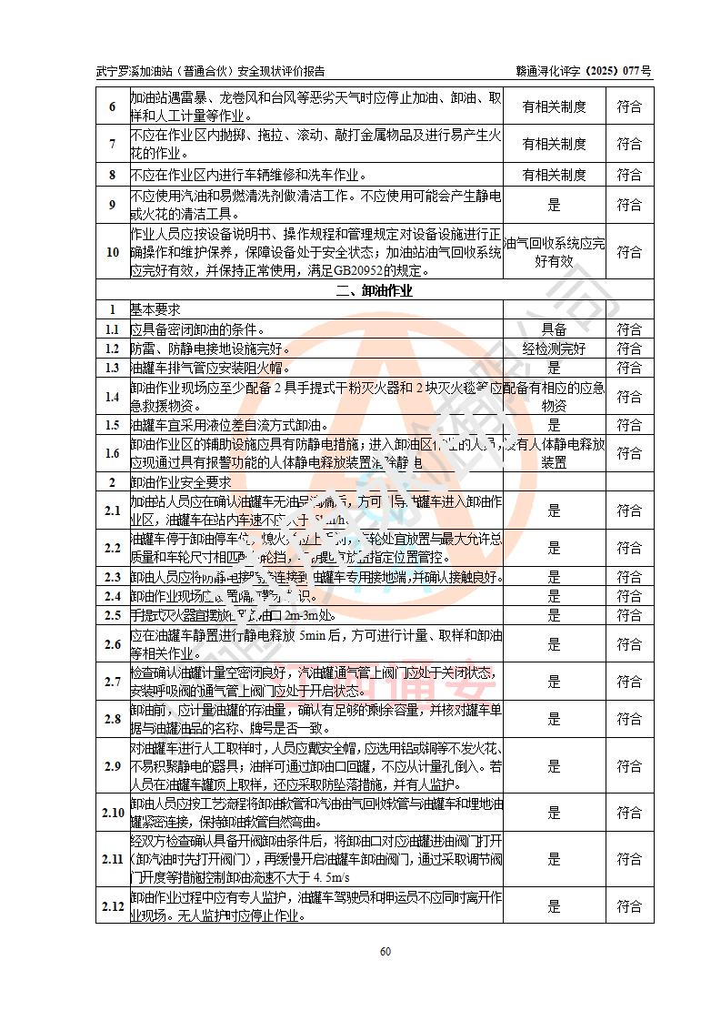 評價結(jié)論 | 武寧羅溪加油站(普通合伙)涉及的安全條件、安全經(jīng)營條件、安全生產(chǎn)管理符合《危險化學(xué)品經(jīng)營許可證管理辦法》、《汽車加油加氣加氫站技術(shù)標準》等**有關(guān)法規(guī)、標準、規(guī)范要求,能滿足危險化學(xué)品經(jīng)營安全條件。 | |||